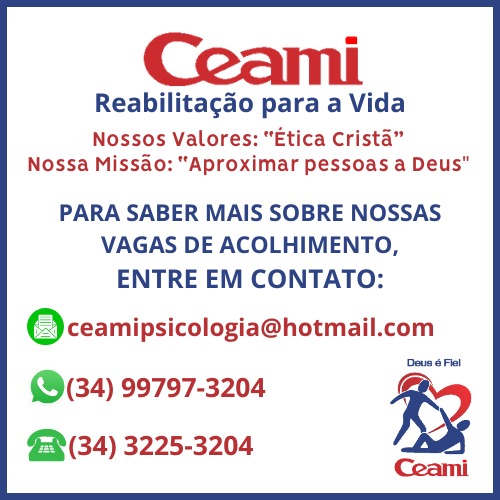 A CEAMI – Reabilitação para a vida foi estabelecida em 1997 com o nobre propósito de servir como um refúgio e fonte de apoio para homens que se encontram em situação de extrema vulnerabilidade. Nosso compromisso é oferecer um tratamento abrangente para jovens e adultos que possuem histórico de dependência química. Através de nossa abordagem, buscamos a restauração integral do indivíduo, promovendo sua reintegração socioafetiva, tanto no seio familiar quanto na sociedade.